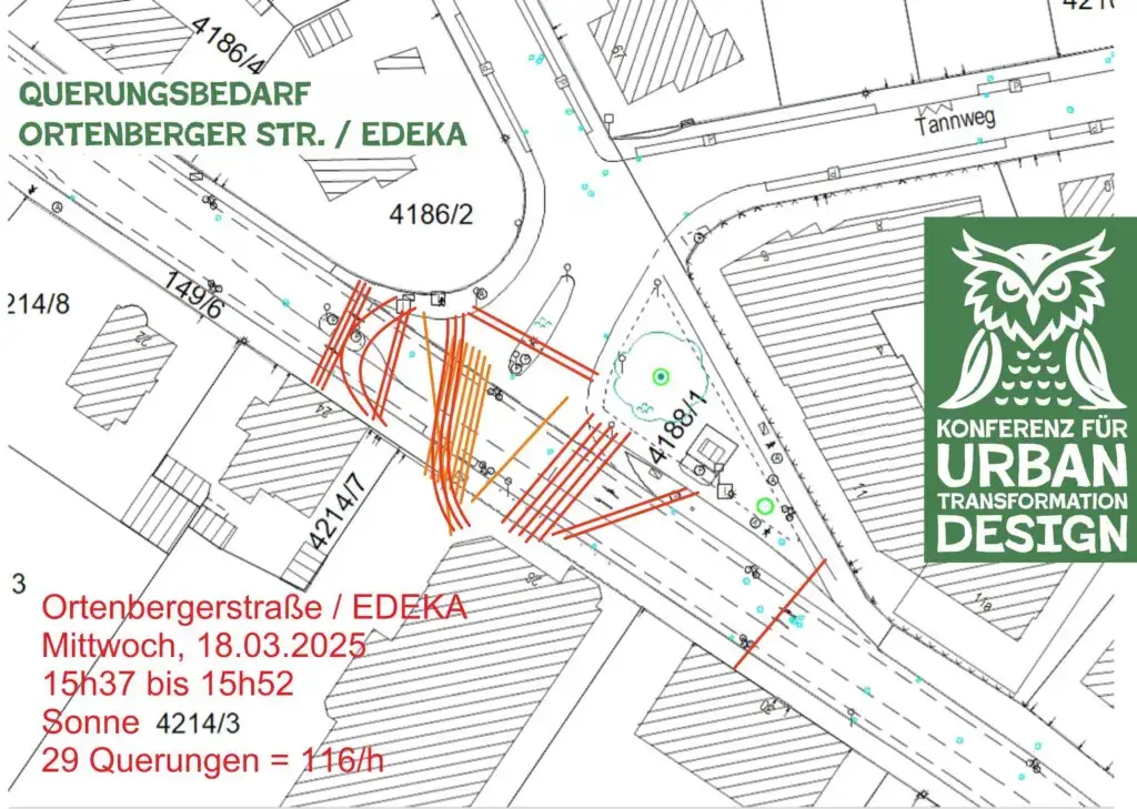 Im Vorfeld unserer Aktion „Zebrastreichen“ am 1. April 2025 haben wir konkrete Zahlen zum Querungsbedarf auf der Ortenbergerstraße vor dem EDEKA erhoben – mit alarmierenden Ergebnissen. Es ist vor allem eines: Unübersichtlich!