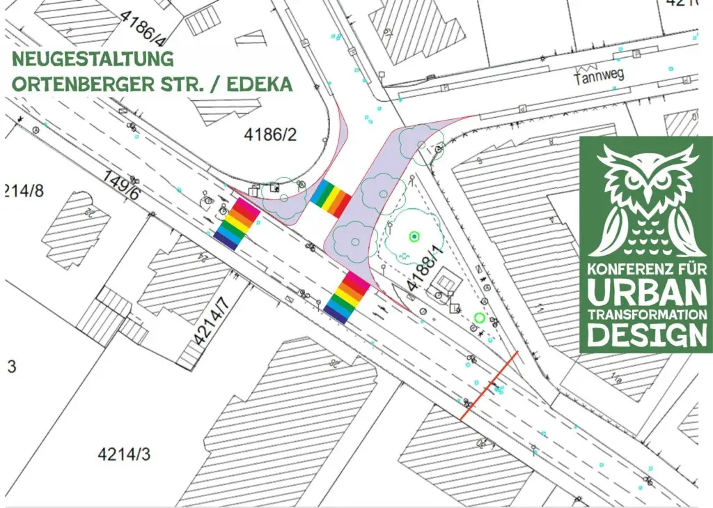 - Verengung der Einfahrt in den Tannweg: Dies reduziert die Querungsdistanz für Fußgänger:innen, schafft mehr Übersicht und zwingt abbiegende Fahrzeuge zu langsameren Geschwindigkeiten. Zudem eröffnet diese Maßnahme die Chance, den derzeit großflächig versiegelten Bereich zu entsiegeln und Raum für mindestens vier neue Bäume zu schaffen, was das Mikroklima verbessern und den Ort insgesamt attraktiver gestalten würde.