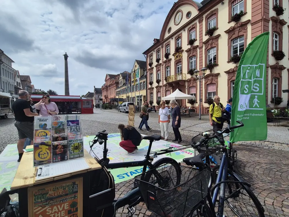 Am Samstag lag unser begehbarer Stadtplan direkt vor dem Rathaus – und mit ihm die Ideen, Wünsche und Forderungen der Offenburger:innen. Viele Passant:innen hielten inne, schauten, diskutierten, markierten Orte, an denen sie Veränderungen wünschen. Immer wieder kamen klare Botschaften: Mehr Tempo 30. Bessere Wege für Rad und Fuß. Trinkbrunnen. Schatten. Stadtgrün.