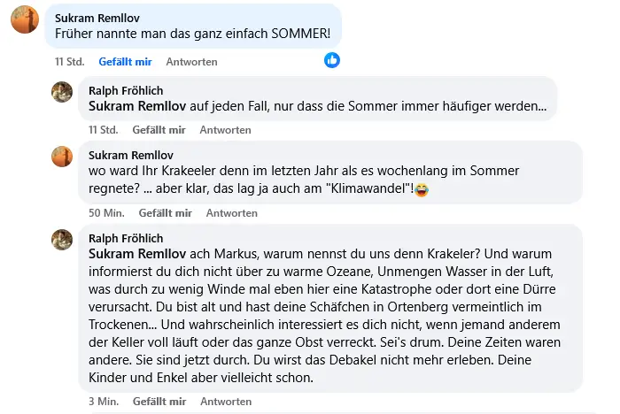 Denn wir reden hier nicht über Wetter. Wir reden über eine strukturelle Erderhitzung, verursacht durch menschliches Handeln. Wer das heute noch ignoriert oder lächerlich macht, stellt sich gegen das Wohl künftiger Generationen.