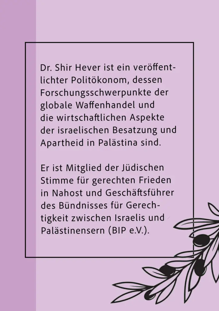 Dr. Shir Hever ist ein israelischer Ökonom, Autor und politischer Aktivist, der sich mit wirtschaftlichen und politischen Aspekten des Nahostkonflikts befasst. Er ist bekannt für seine kritische Analyse der israelischen Wirtschaftspolitik und der Besatzung Palästinas. Hever hat mehrere Bücher und Artikel zu diesen Themen veröffentlicht.