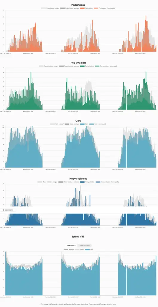 Die Durchschnitsgeschwindigkeit (V85) liegt in den Hauptverkehrszeiten bei ca. 35 km/h. In den Tagesrandzeiten jedoch bei fast 50 km/h (im Durchschnitt!). Mehrere Autofahrer:innen nutzen das geringe Verkehrsaufkommen morgens und abend zum Teil mit über 70 km/h. Gerade dann, wenn auch die meisten Fußgänger:innen und Radfahrer:innen unterwegs sind und die Straße queren.